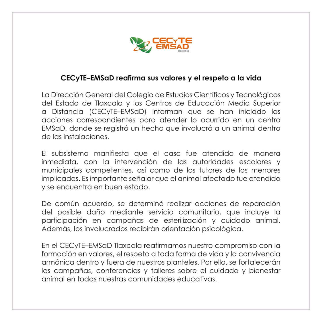 En el CECyTE–EMSaD Tlaxcala reafirmamos nuestro compromiso con la formación en valores, el respeto a toda forma de vida y la convivencia armónica dentro y fuera de nuestros planteles. Por ello, se fortalecerán las campañas, conferencias y talleres sobre el cuidado y bienestar animal en todas nuestras comunidades educativas. (Boletín)